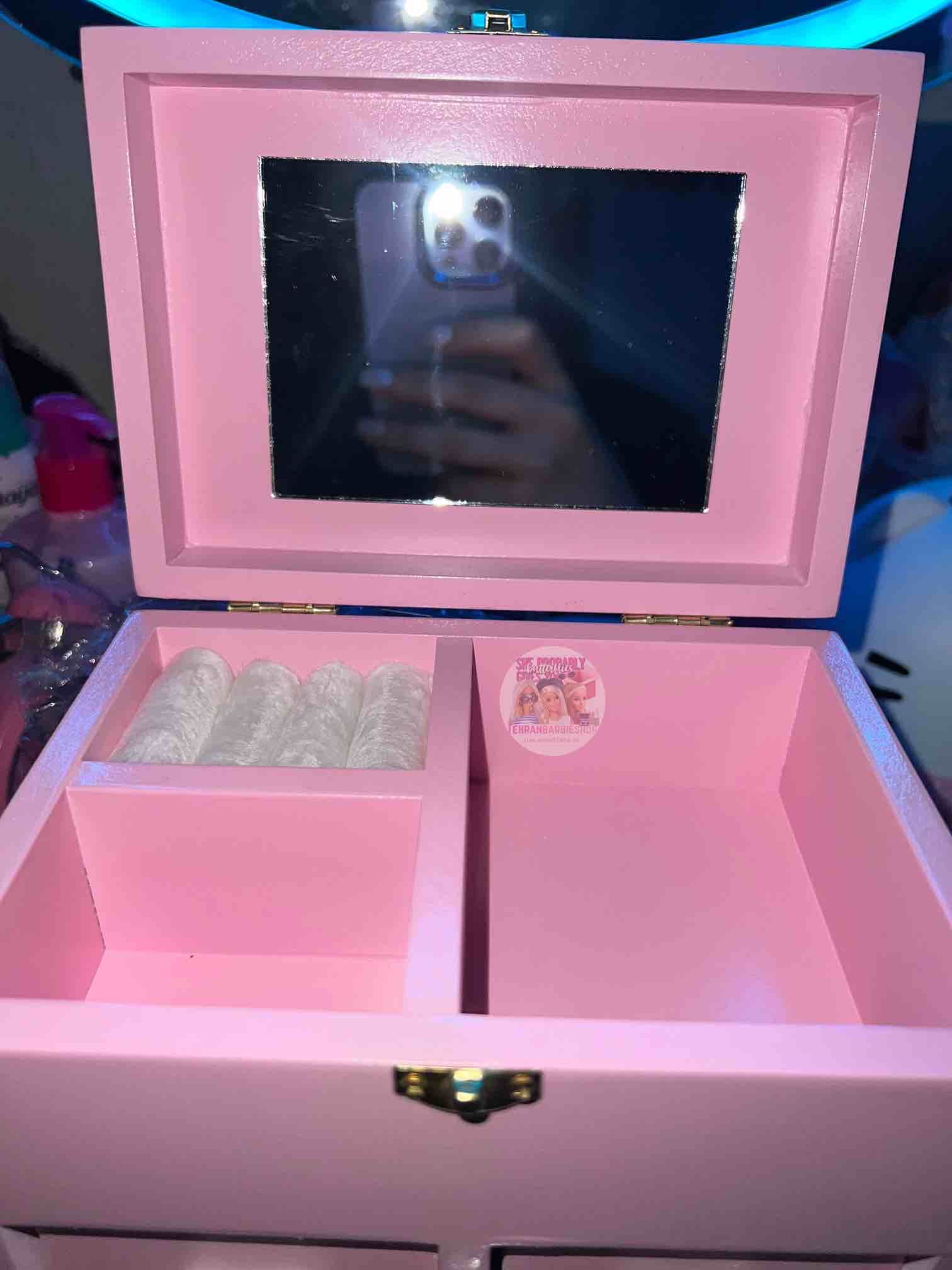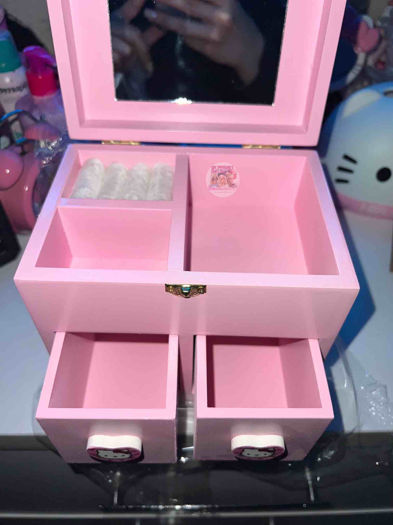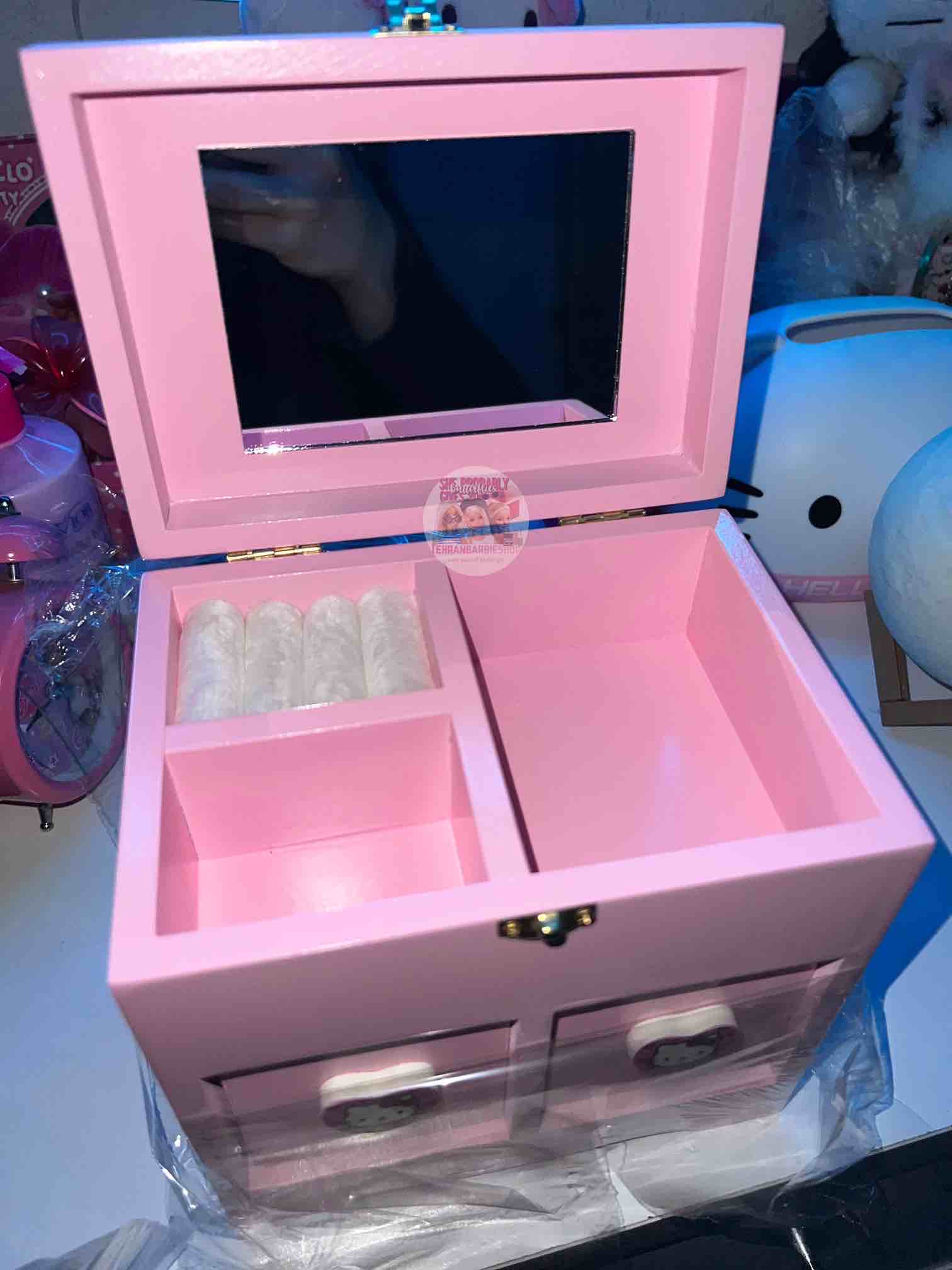 جا جواهری کیتی جنس چوبی ، رنگ صورتی دارای آینه و ۲کشو جادار ۲قسمت مجزا همراه با یکقسمت مخصوص انگشتر🎀 ابعاد: ۱۶ طول و ۱۶/۵ ارتفاع و ۱۲عرض دارای قفل
